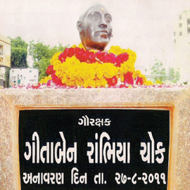 Saver of Cow. Goddess of non-violence, Gitaben was born at Jabalpur in Madyapradesh on 30th June, 1957, She lost patron of hear parents at the age of three. She was taken to Mumbai, her maternal uncle for her nourishment and study. She started study in the St. Xaviers of Mumbai and completed her study of M.A. also in that college. Detender of cow. Gitaben had much affection towards dumb lives. The passion was converted in to passion and since then she determined that something should be done for dumb lives. She got married with Bachubhai Rambhiya, resident of Ramania village of Kutch at the age of 20. Marriage life was beginned at ramania village and started activities for compassion of lives, they came to Ahmedabad to make the city her field of activities of compassion for lives of Gitaben, Shri Sureshbhai S. Zaveri, President appointed her as an honorary inspector for saving the dump lives going to slaughterhouse illegally. After her appointment, she started her career, saving five cows on Nov 1984 at Pankornaka in Ahmedabad City, Being successed by this task, enhancement to the pleasure for doing such work. Then after, whenever it occurred to got out at any slaughter house keeping workers together, she always kept hunter. Therefore, people gave her nick name of “Hunterwali Bai”.